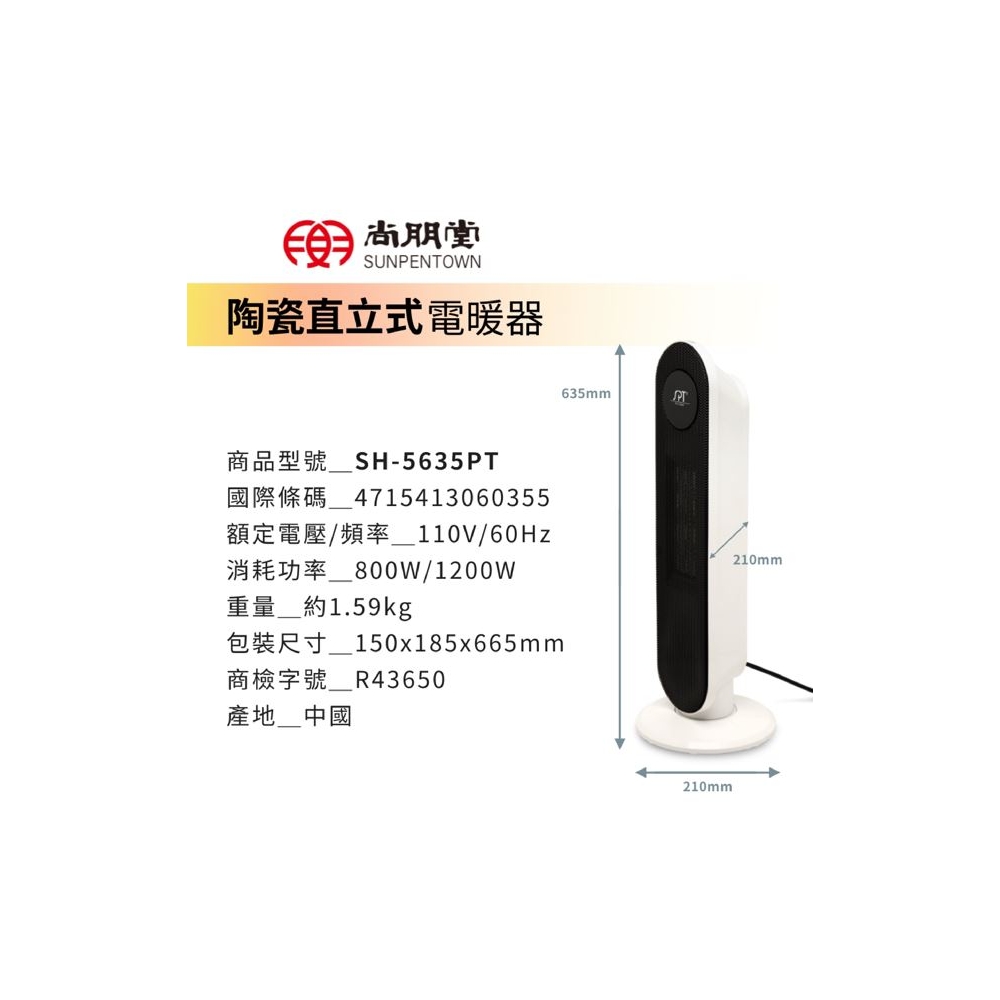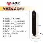 | 品 名 | 陶瓷直立式電暖器 | 型 號 | SH-5635PT | 消耗功率 | 1200W |