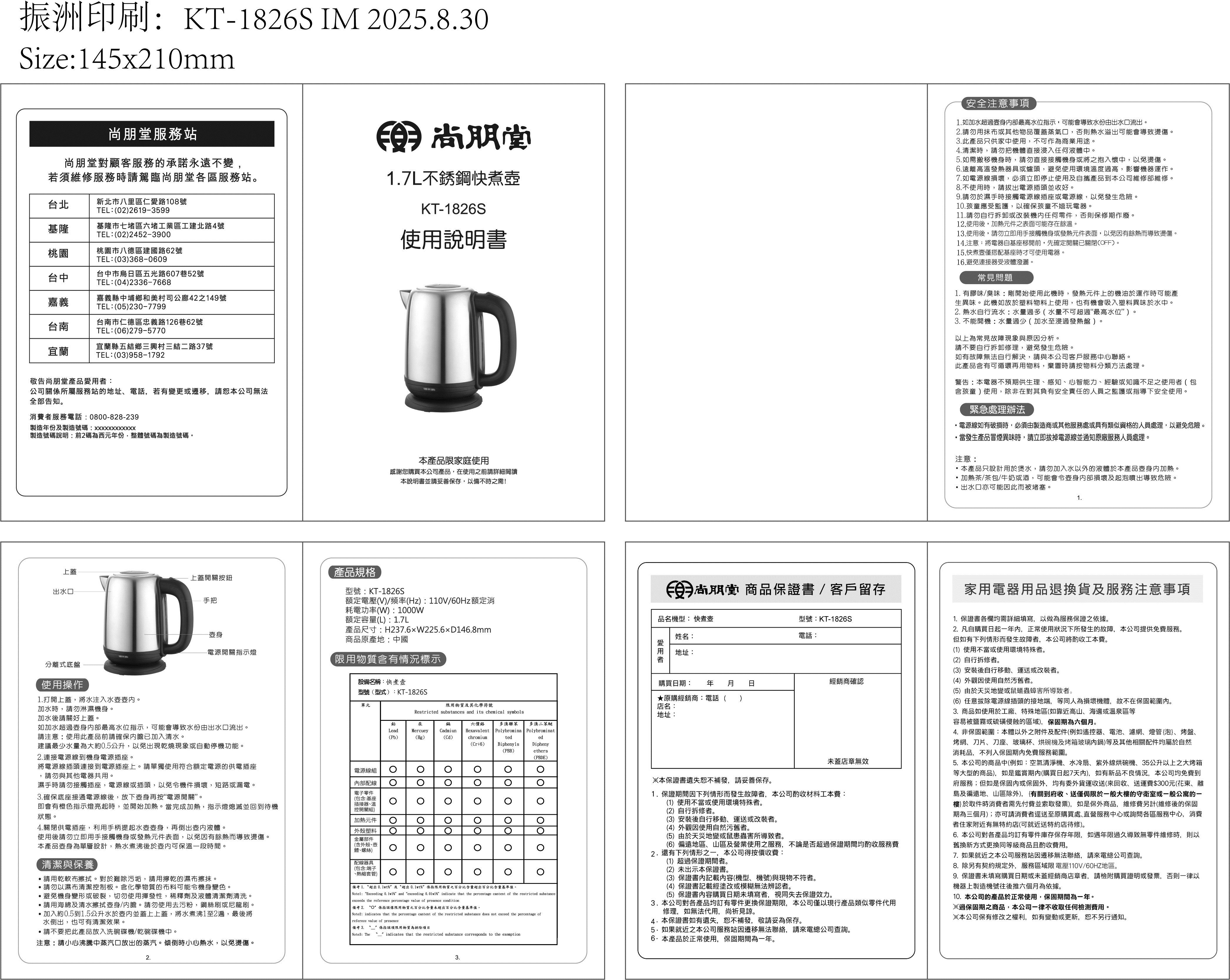 | 品 名 | 1.7L大容量不鏽鋼快煮壺 | 型 號 | KT-1826S | 消耗功率 | 1000W |