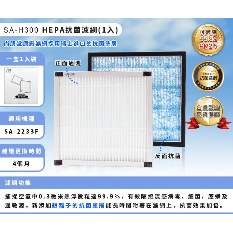 | 品 名 | HEPA抗菌濾網(SA-2233F) | 型 號 | SA-H300 | 消耗功率 | |