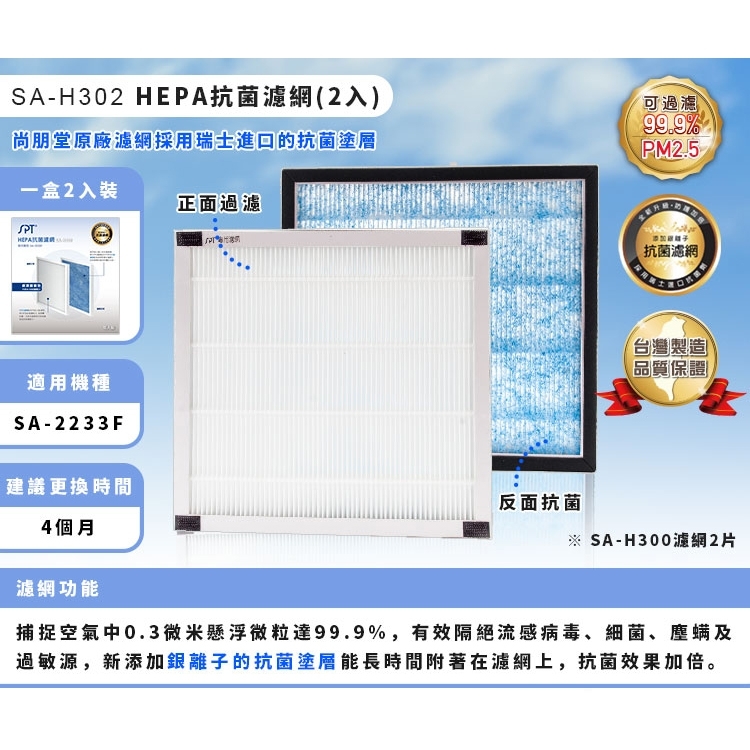 品 名 | HEPA抗菌濾網2入(SA-2233F) | 型 號 | SA-H302 | 消耗功率 | |
