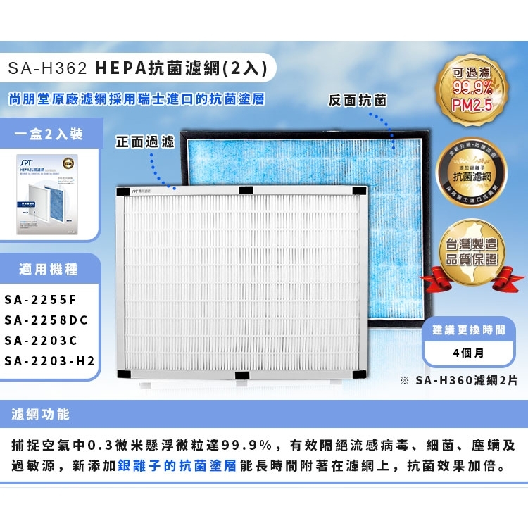 品 名 | HEPA抗菌濾網(SA-2203C/2255F/2258DC) | 型 號 | SA-H362 | 消耗功率 | |