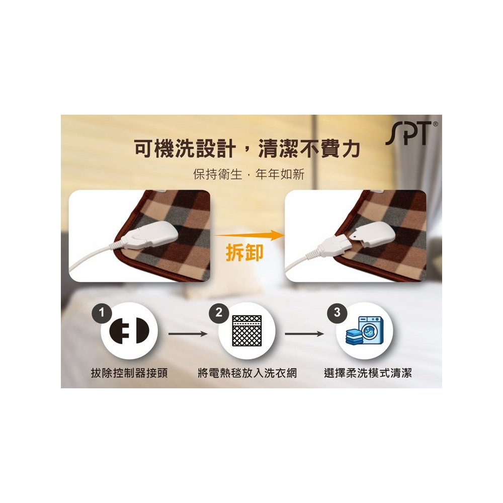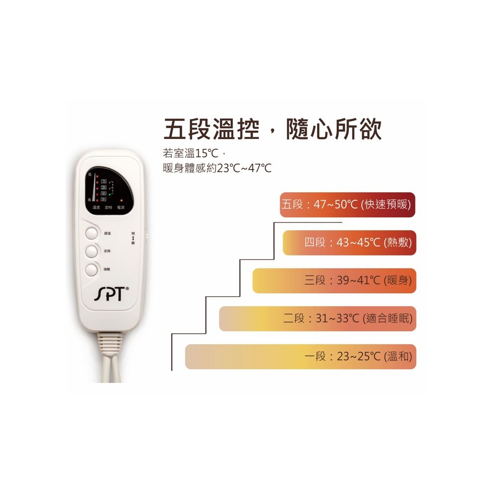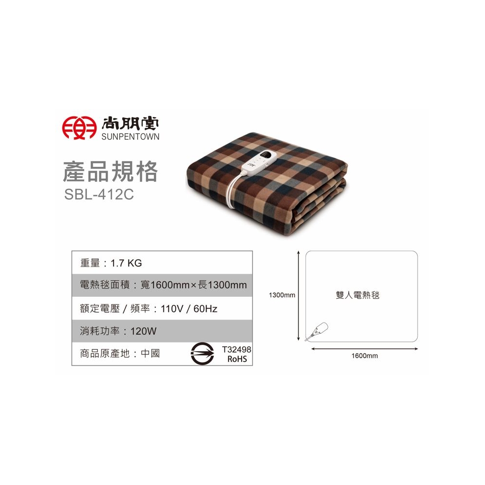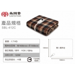 | 品 名 | 微電腦雙人電熱毯(短絨毛) | 型 號 | SBL-412C | 消耗功率 | 120W |