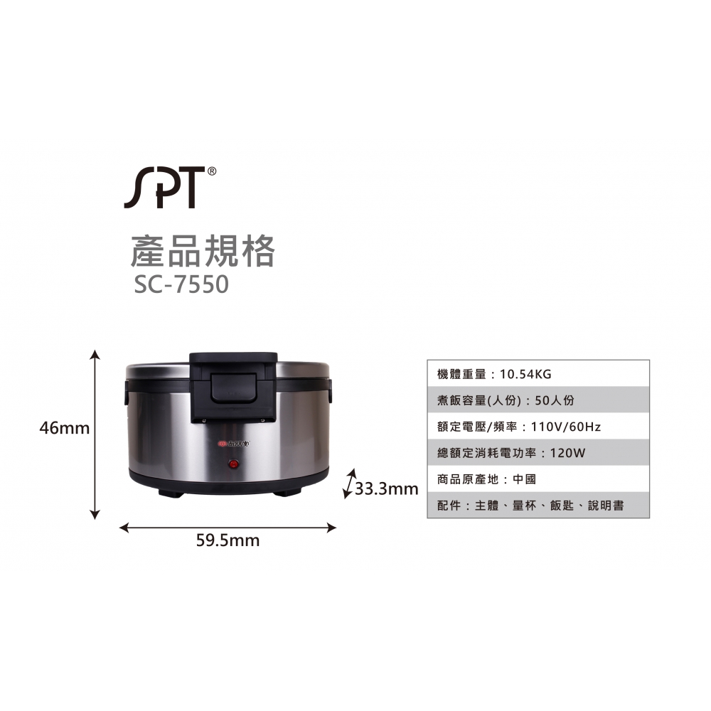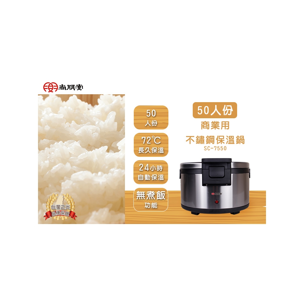 品 名 | 50人份營業用保溫飯鍋 | 型 號 | SC-7550 | 消耗功率 | 120W |