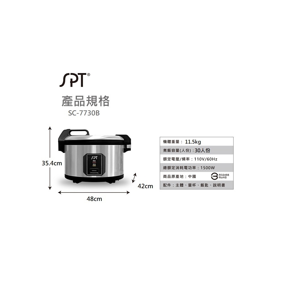 品 名 | 30人份煮飯鍋 | 型 號 | SC-7730B | 消耗功率 | 1500W |