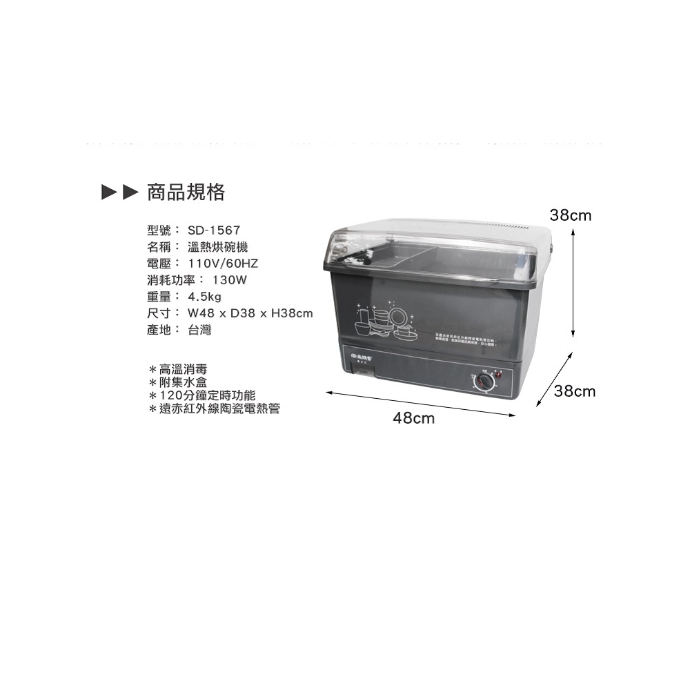 品 名 赤紅外線陶瓷烘碗機 型 號 SD-1567 消耗功率 130W