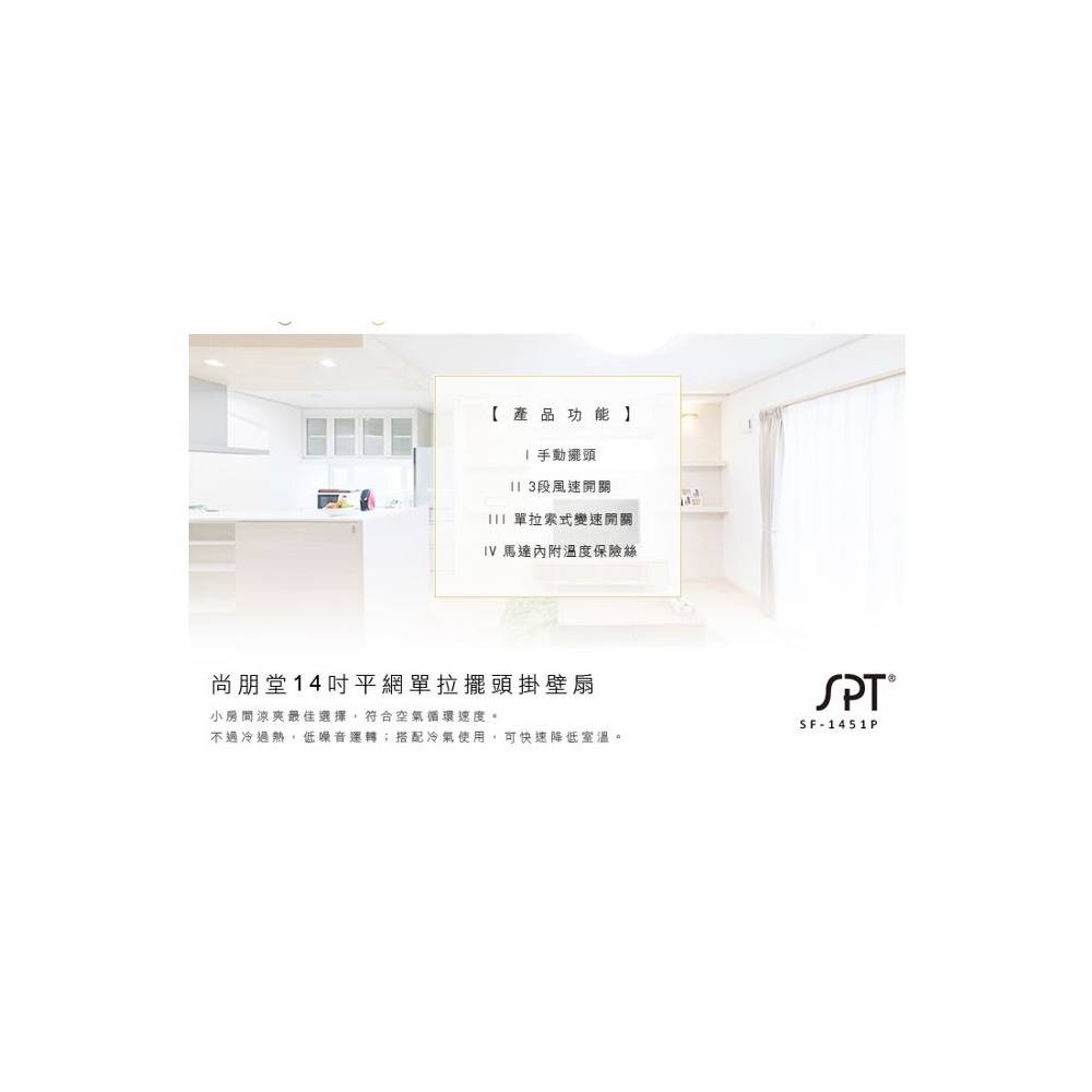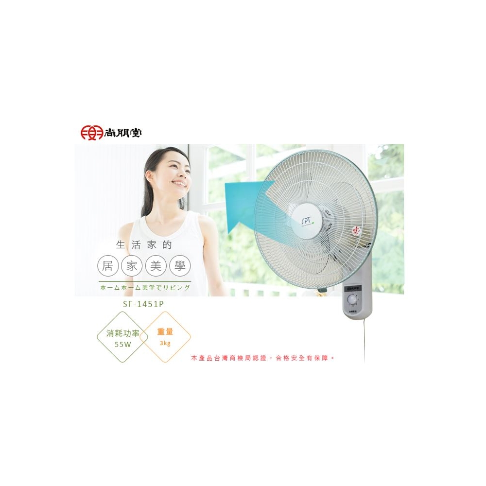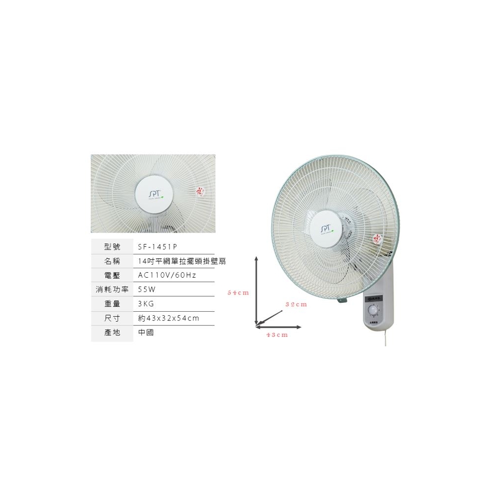 品 名 | 14吋平面壁扇(5翼) | 型 號 | SF-1451P | 消耗功率 | 55W |