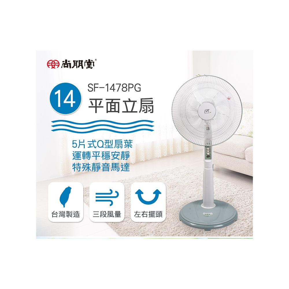 | 品 名 | 14吋平面立扇 | 型 號 | SF-1478PG | 消耗功率 | 55W |