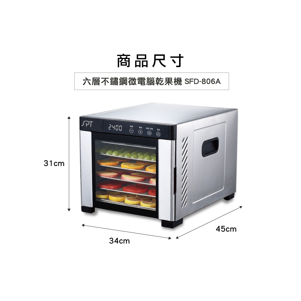 品 名 | 六層不鏽鋼微電腦乾果機 | 型 號 | SFD-806A | 消耗功率 | 600W |