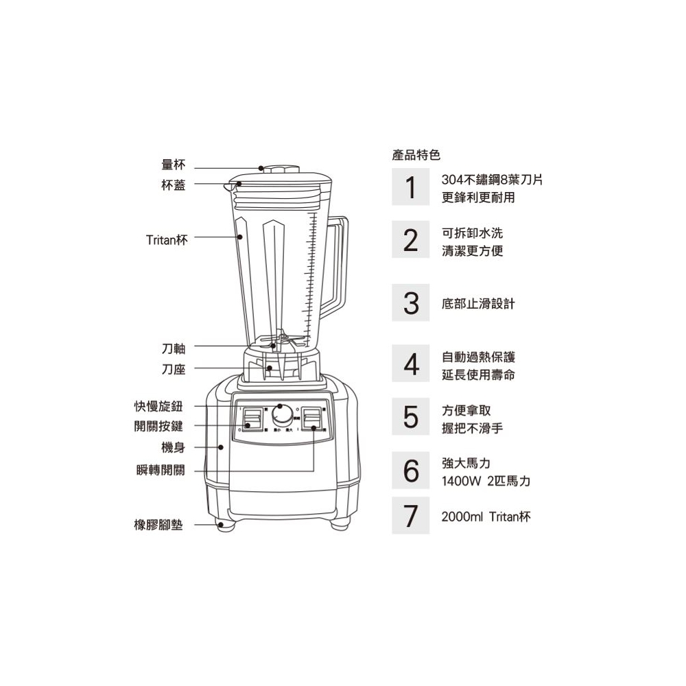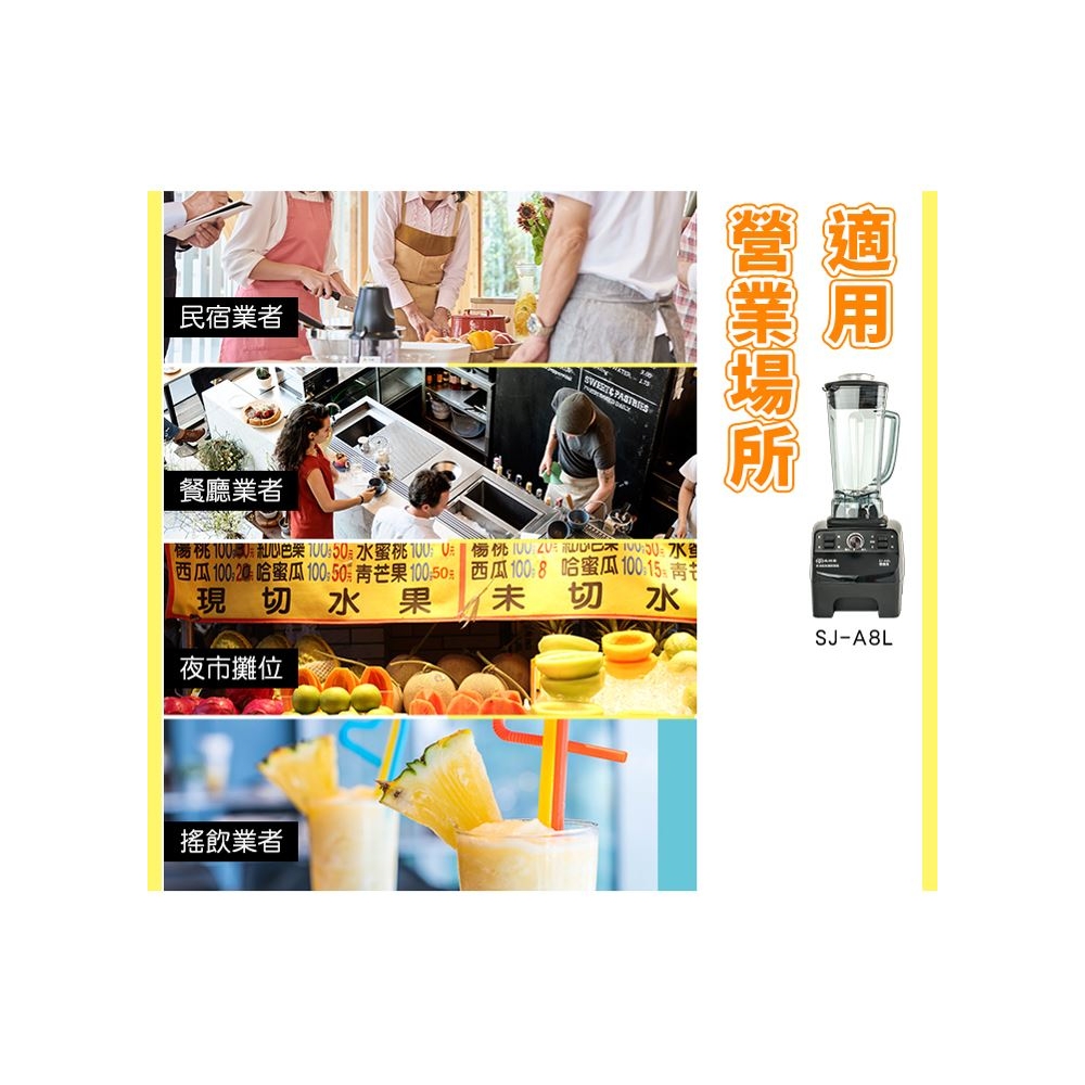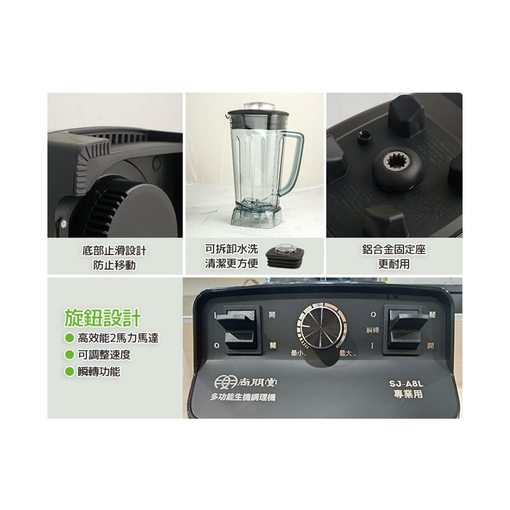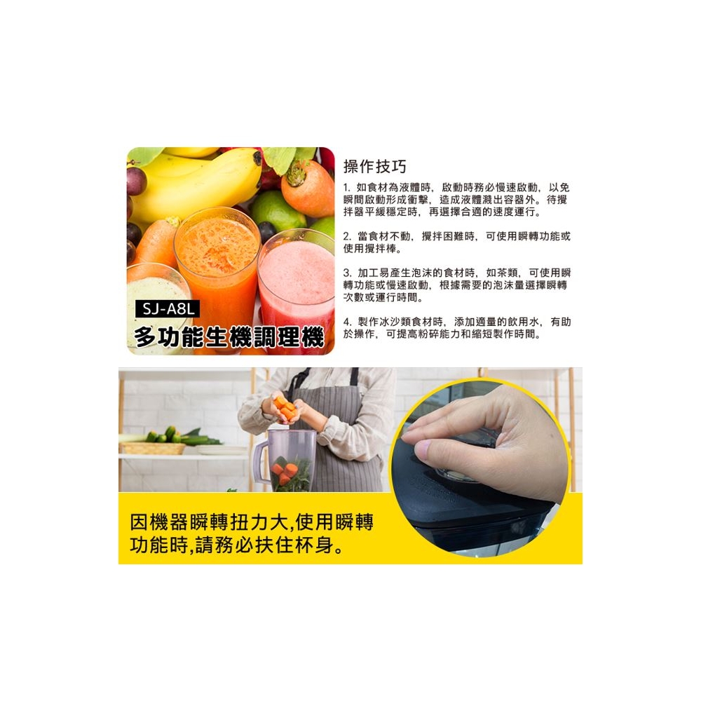 品 名 | 多功能生機調理機 | 型 號 | SJ-A8L | 消耗功率 | 1400W |
