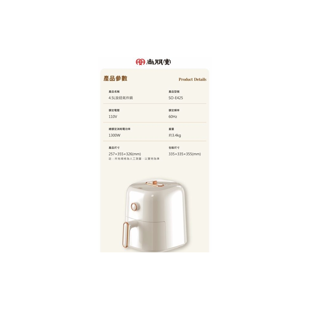 品 名 | 4.5L氣炸鍋 | 型 號 | SO-E425 | 消耗功率 | 1300W |